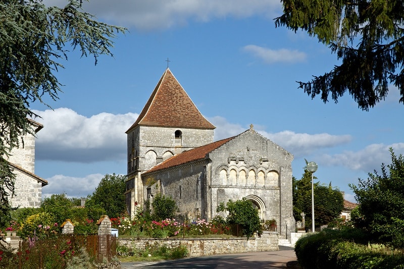 The nave of this 12th-century church ends in a flat chevet. The square-plan choir is vaulted with a cupola on pendentives. The west facade is decorated with a row of arcatures resting on columns whose capitals are decorated with foliage and animals. This is a listed building.