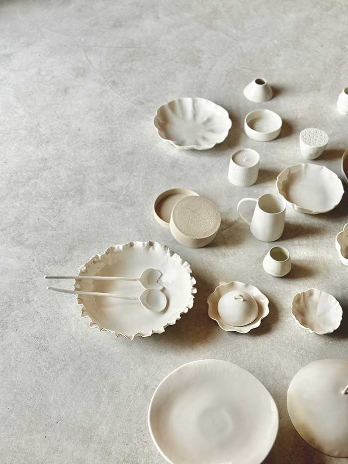 Ses formes sont poétiques et florales, les couleurs épurées, dans des nuances de beiges et de blancs.